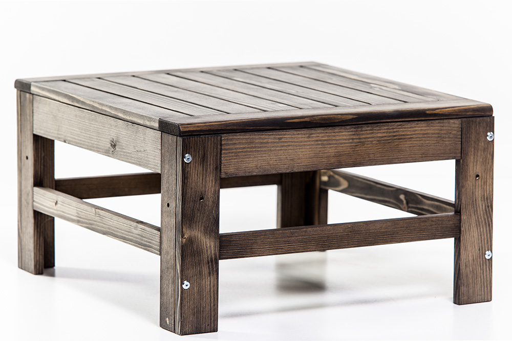 Garnitură cu şezut scund pentru terasă, din lemn de brad, dotată în mod estetic cu perne confortabile. Modulele de diferite forme şi dimensiuni pot fi combinate în mod individual, după gustul fiecăruia.