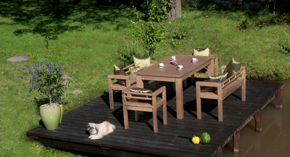 Fenyőből készült hatszemélyes terasz garnitúra. Modern stílusa egyenes vonalvezetése igényes megjelenést sugall.